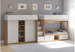 • Составная трехъярусная кровать – это две или три кровати, стоящие рядом. Такой комплект может состоять из двухъярусной кровати и кровати-чердака, что дает определенное преимущество в виде игровой зоны под одним из верхних спальных мест. В этом случае все места для сна параллельны друг другу и находятся на одном и том же расстоянии от стены. Также можно составить трехъярусную кровать из трех кроватей: двух чердаков и низкой кроватки, которая отлично вписывается под одним из чердаков. Зачастую нижняя кровать располагается перпендикулярно, что, с одной стороны, освобождает дополнительное место под чердаком, а с другой – перекрывает часть места, так как кровать выдается вперед. Данный набор отлично вписывается по двум прилегающим стенам комнаты, как угловой.